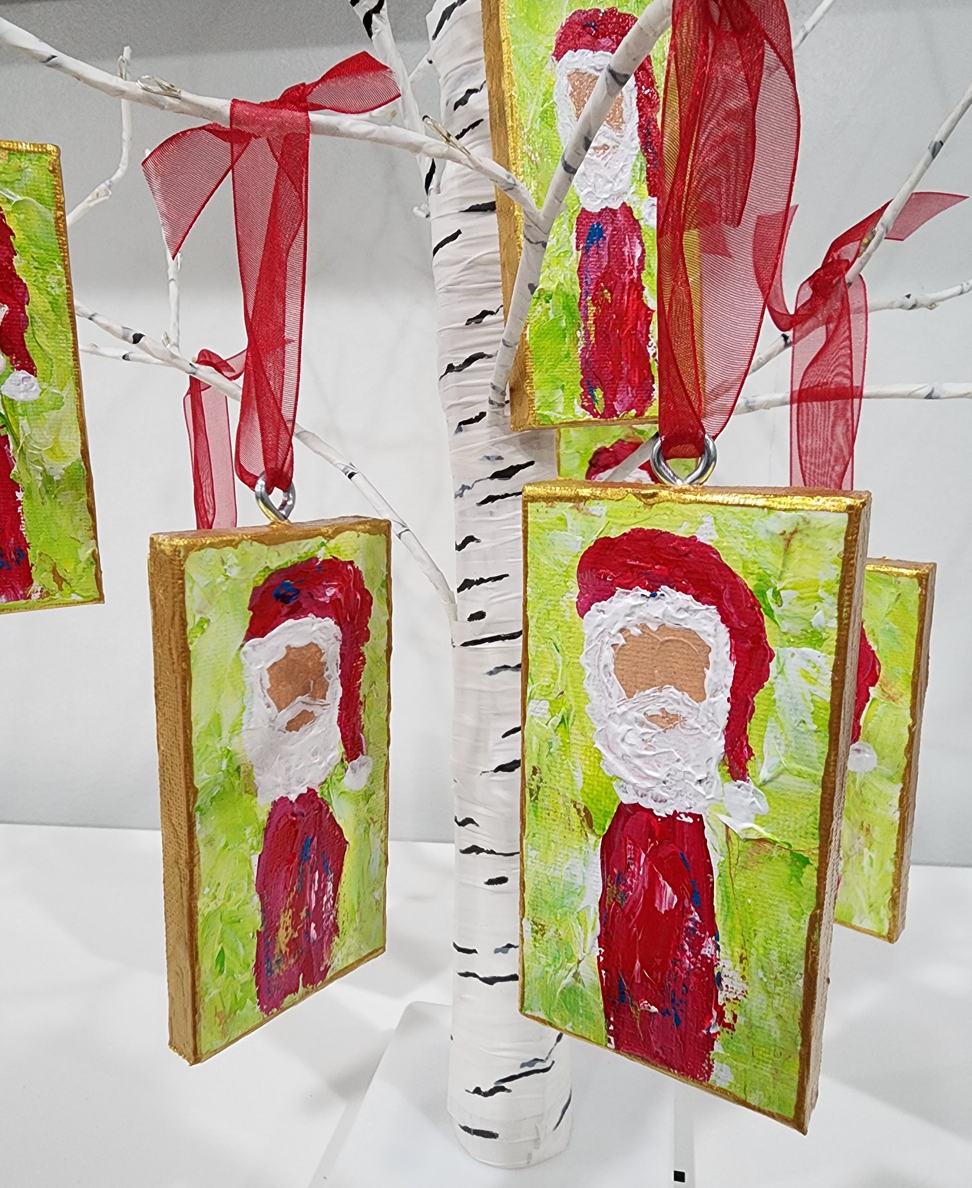 Hand-painted Santa ornament with bright, textured brushstrokes and gold edges. Each piece is one-of-a-kind and finished with a ribbon hanger—perfect for adding festive charm to any tree.