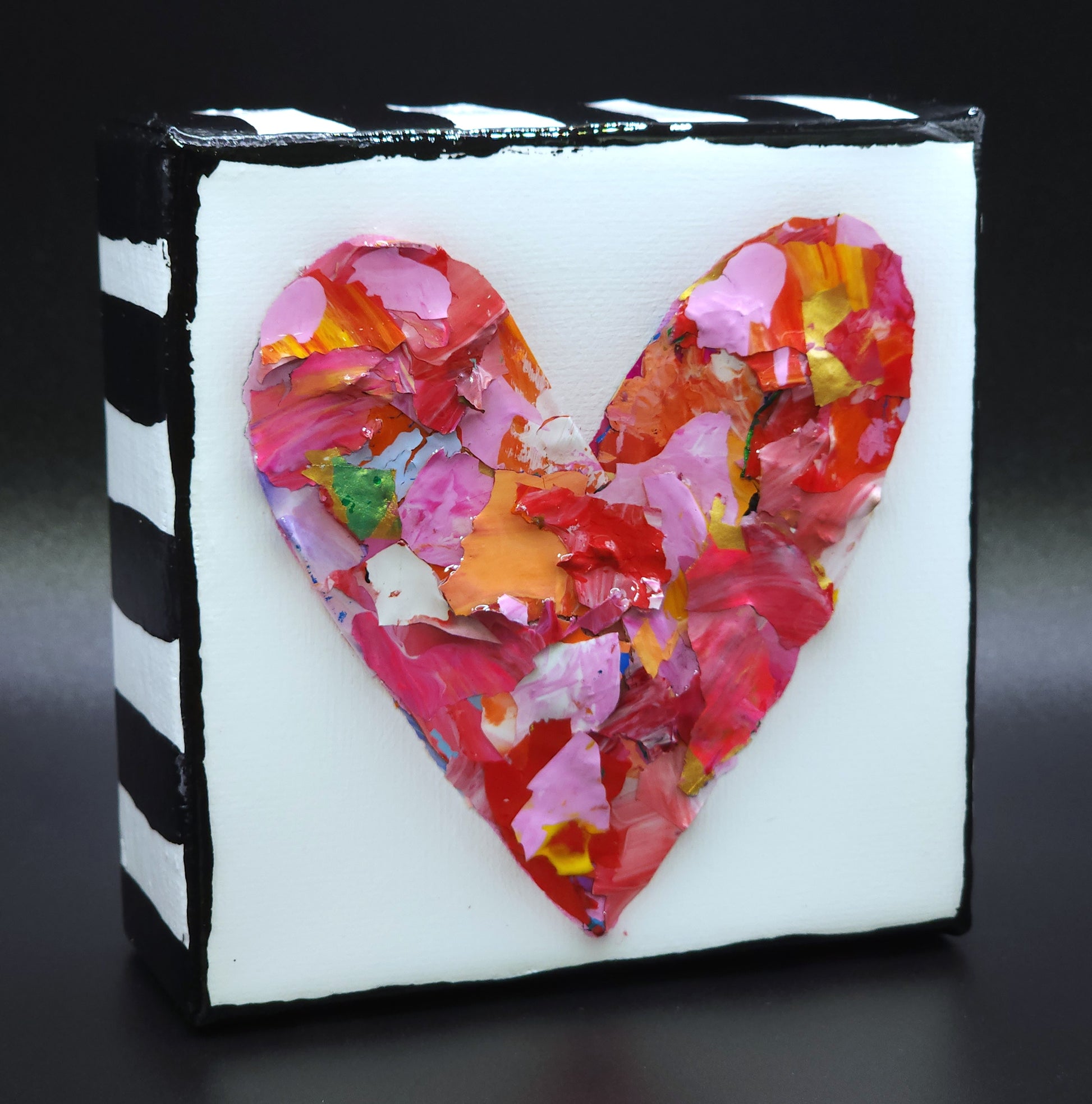 Each piece of artwork is uniquely created with recycled paint chips and covered in resin.